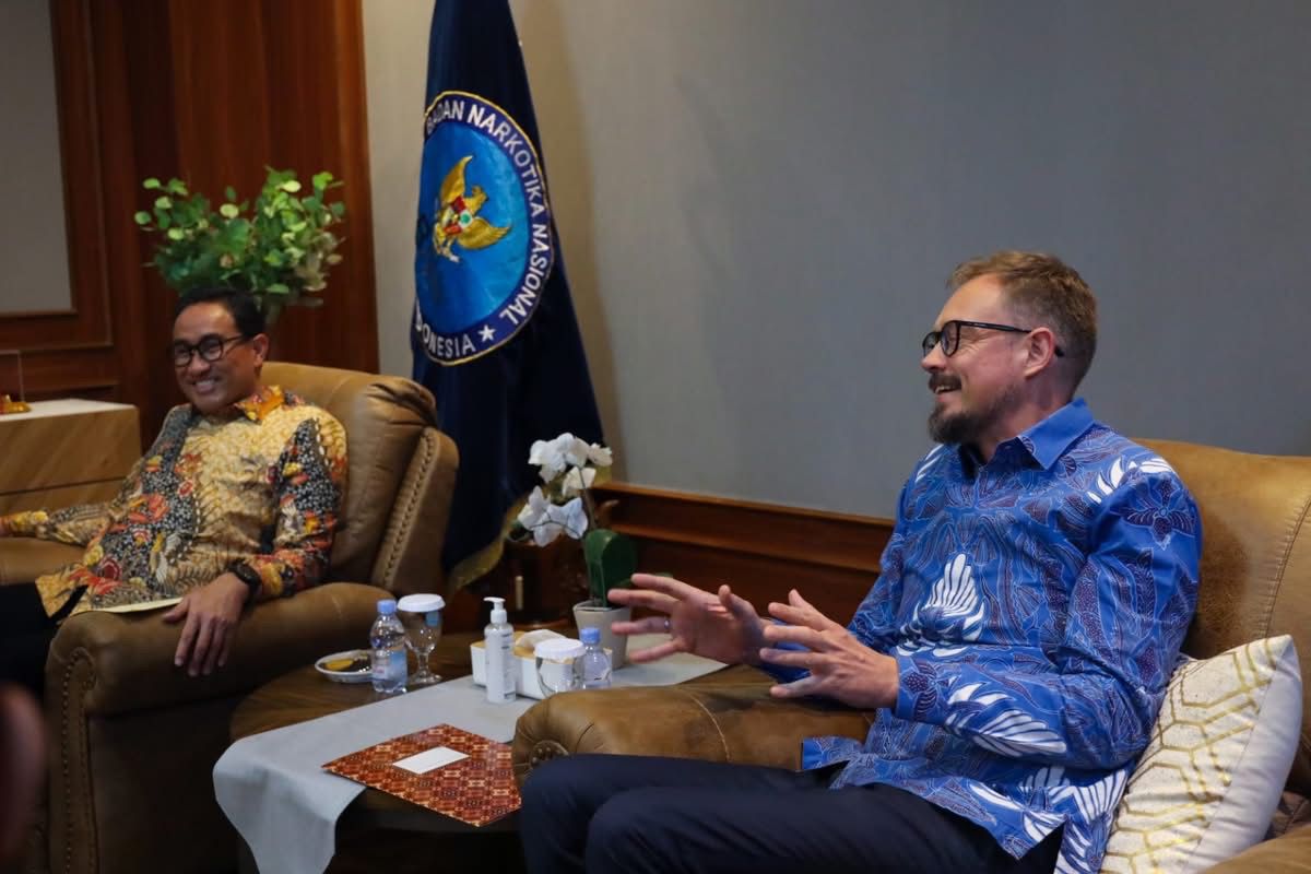 KAKARTA,-detektifswuad.com-Kepala BNN RI, Suyudi Ario Seto, menerima kunjungan kehormatan dari Mr. Erik Van Der Veen, UNODC Head of Office and Liaison to ASEAN pada Kamis (25/9). Pertemuan yang berlangsung di Gedung Tan Satrisna BNN, Cawang, Jakarta Timur, ini dihadiri oleh jajaran pejabat utama BNN serta perwakilan UNODC: Mr. Narendra Narotama, UNODC Programme Officer for Drug Demand Reduction, dan Mr. Ade Aulia, Programme Coordinator-Drug Demand Reduction and HIV UNODC Programme.