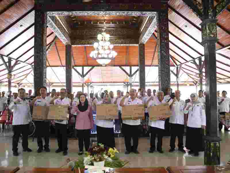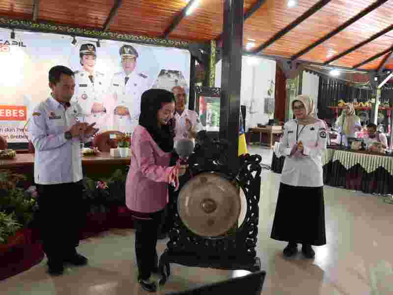 Peluncuran Kios Adminduk ditandai dengan pemukulan gong dan penyerahan 17 unit PC Komputer secara simbolis oleh Bupati Brebes, Hj. Paramitha Widya Kusuma, S.E., M.M., kepada perwakilan camat, yang bertempat di Pendopo Kabupaten Brebes, Rabu (8/10/25).