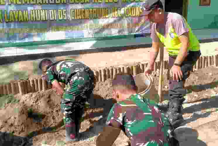 Tampak dalam kegiatan tersebut, anggota Satgas TMMD bahu-membahu bersama warga setempat. Aksi gotong royong ini mencerminkan tingginya dedikasi dan tanggung jawab untuk memastikan bahwa hasil pekerjaan benar-benar maksimal sebelum diserahkan kepada penerima manfaat.