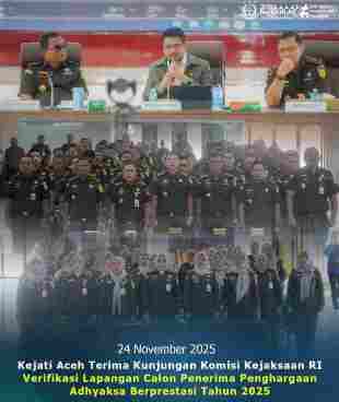 Banda Aceh – Kejaksaan Tinggi (Kejati) Aceh menerima kunjungan kerja dan verifikasi lapangan dari Komisi Kejaksaan Republik Indonesia (KKRI) pada hari ini. Kunjungan ini merupakan bagian esensial dari proses Penganugerahan Komisi Kejaksaan RI Tahun 2025, dengan fokus memverifikasi langsung unit kerja dan individu yang diusulkan berprestasi di lingkungan Kejati Aceh.