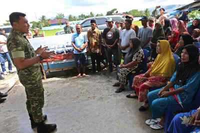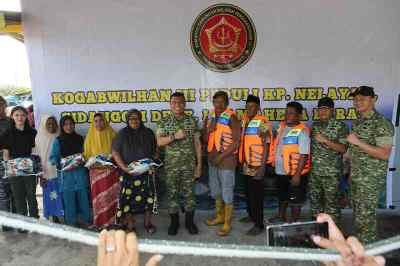 Pada kegiatan tersebut, TNI menyerahkan bantuan berupa 100 sak beras dan 100 life vest
