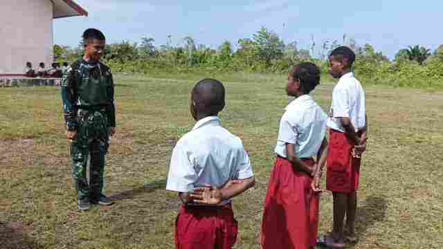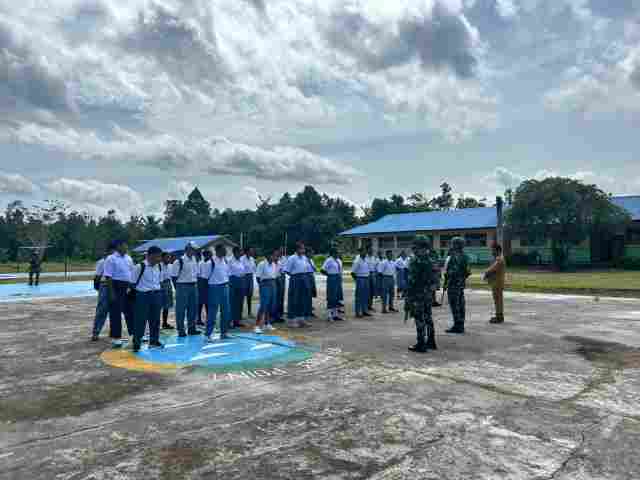 Di lingkungan SD Inpres Amazu, personel Pos Kaibar melaksanakan sesi pembinaan khusus bagi siswa. Materi yang disampaikan mencakup pembiasaan disiplin melalui latihan baris berbaris, pentingnya menjaga kebersihan lingkungan sekolah, serta pemahaman awal tentang nilai-nilai kebangsaan.