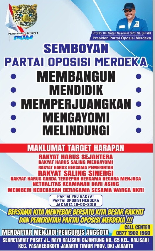 JAKARTA – Partai Oposisi Merdeka (POM) secara resmi memperkenalkan landasan perjuangan politiknya yang berfokus pada lima pilar utama: Membangun, Mendidik, Memperjuangkan, Mengayomi, dan Melindungi. Di bawah kepemimpinan Presiden Partai, Prof. Dr. KH. Sutan Nasomal, SPdI, SE, SH, MH, organisasi ini memosisikan diri sebagai wadah aspirasi yang pro-rakyat.