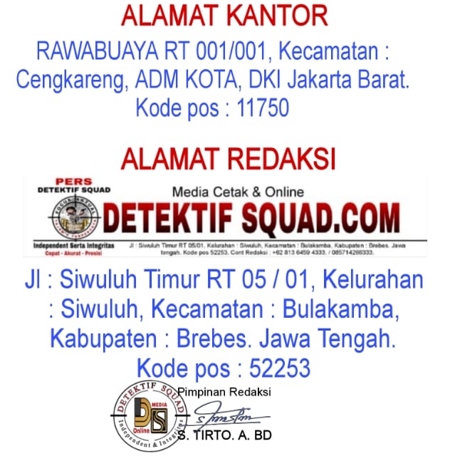 PERHATIAN Redaksi meminta kerja sama dari seluruh instansi, baik Pemerintah Sipil, TNI, Polri, Pengadilan Negeri, Kejaksaan, Swasta, maupun instansi lainnya. Apabila ditemukan oknum wartawan yang mengatasnamakan atau menyalahgunakan kewenangan Media DETEKTIF SQUAD.com dan melakukan perbuatan melanggar hukum, mohon untuk segera ditindak tegas dan dilaporkan kepada pihak berwajib. Redaksi tidak bertanggung jawab atas segala perbuatan yang dilakukan oleh oknum tersebut.